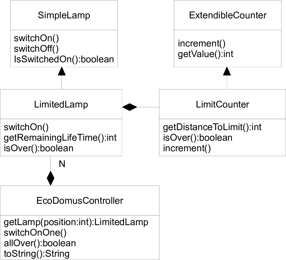 LimitCounterLimitedLamp (via estensione) che contiene un contatore, e che ha un tempo di vita basato sul numero di accensioni ammesseEcoDomusController si compone di $n$ LimitedLamp, e ha la possibilità di verificare se tutte le lampadine sono esaurite, e di accendere la lampadina alla quale è rimasto più tempo di vitaEcoDomusController componesse $n$ SimpleLamp e $n$ LimitCounterLimitedLamp realizza alcuni metodi per delegazione al suo contatore